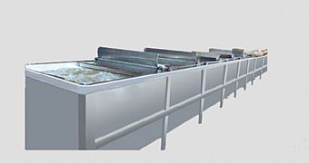 化冰機(jī)采用氣泡與熱水協(xié)作,有效地使物料充分解凍,物料落入水中,利用槽體中翻騰的水將物料攪動,把冷氣帶出擴(kuò)散到空氣當(dāng)中。